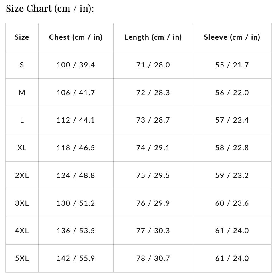 | Taille | Poitrine (cm / in) | Longueur (cm / in) | Manche (cm / in) |
